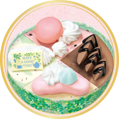 ケーキスタンドに載っているお菓子たちやティーセットをデコレーションで表現しました。