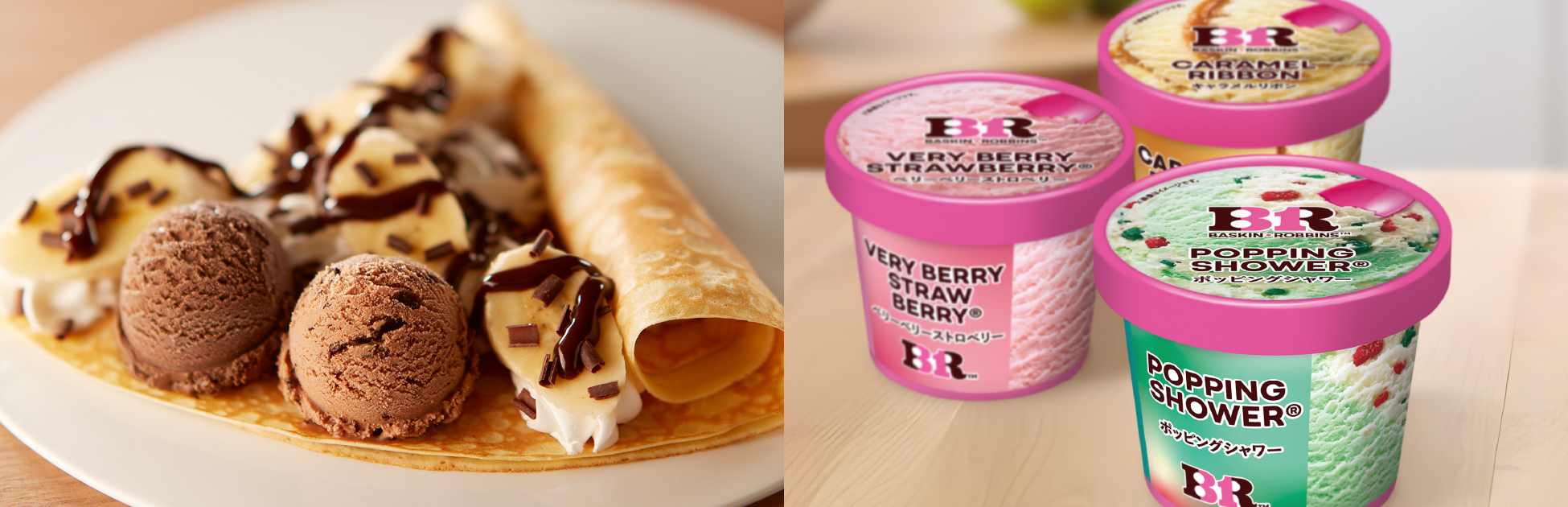 サーティワンアイスクリームのクレープは、お気に入りのアイスクリームを組み合わせて楽しんで頂けます。焼きたてクレープを、冷たいアイスクリームとご一緒にどうぞ。アイスクリームを入れないクレープもございます。