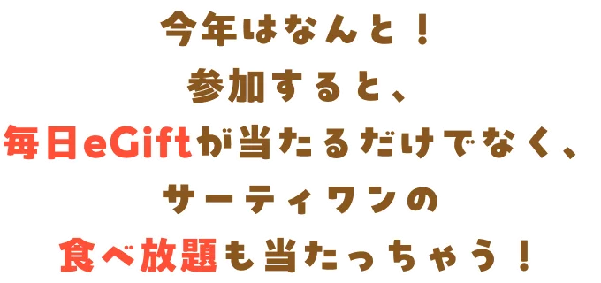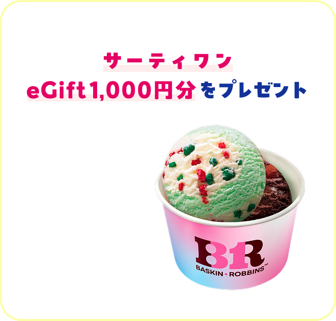 期間中 毎日 抽選でサーティワン eGift1,000円をプレゼント毎日5名様ダブルも投票でA賞・B賞 賞品詳細おみやげ付き!全国5都市で開催 サーティワン 貸し切り食べ放題イベント ご招待合計50組31名様