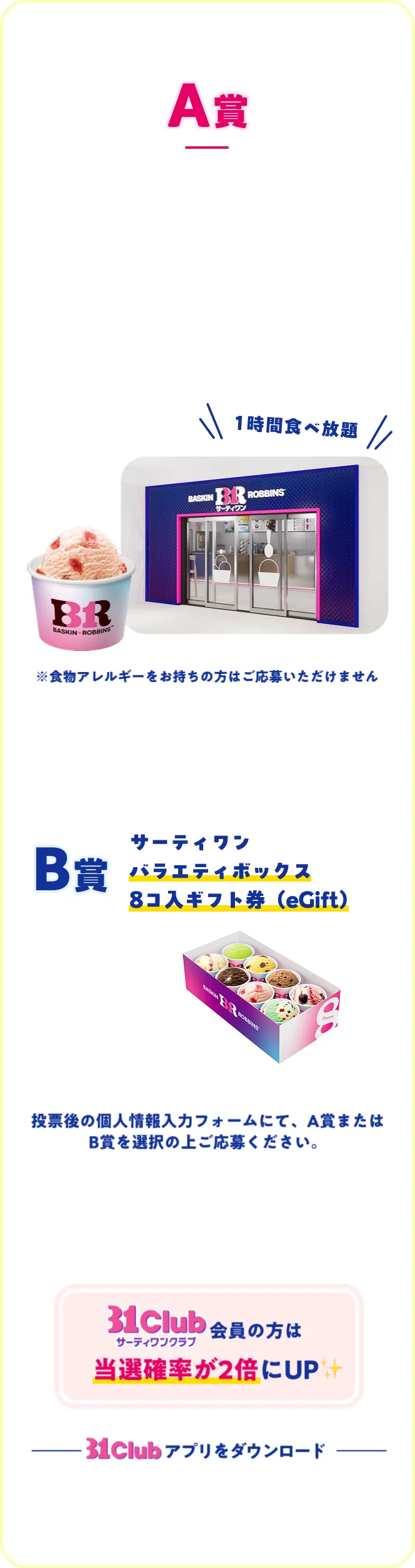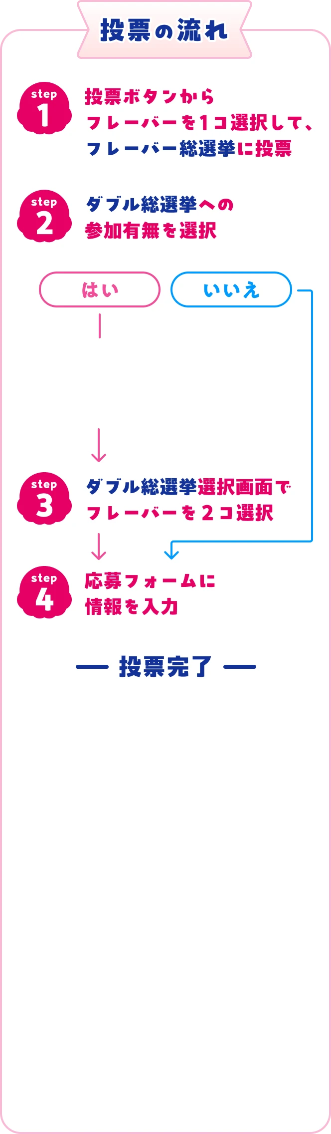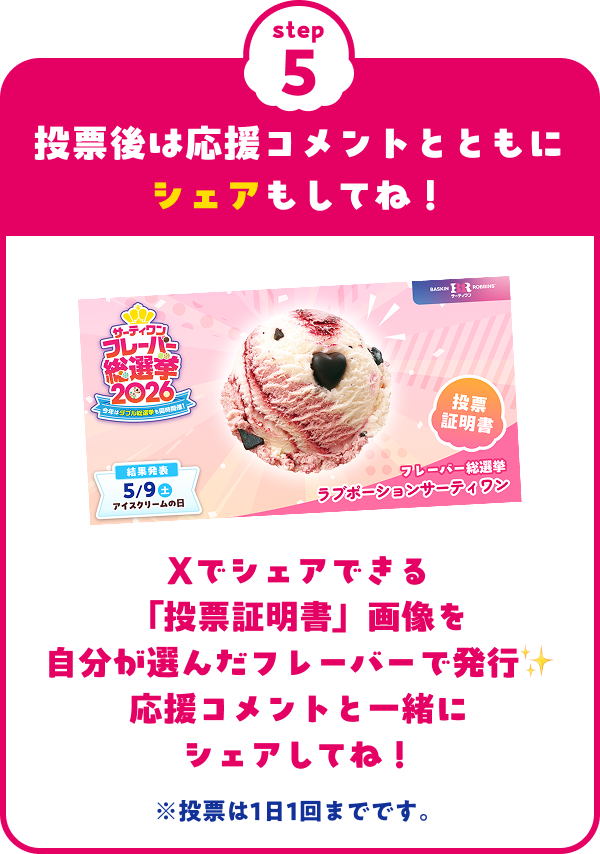 投票の流れサーティワン貸し切り食べ放題イベントが当たる投票後は応援コメントとともにシェアもしてね!