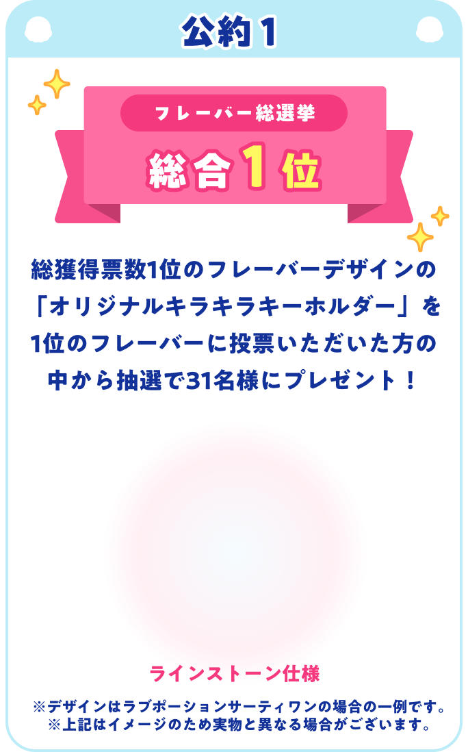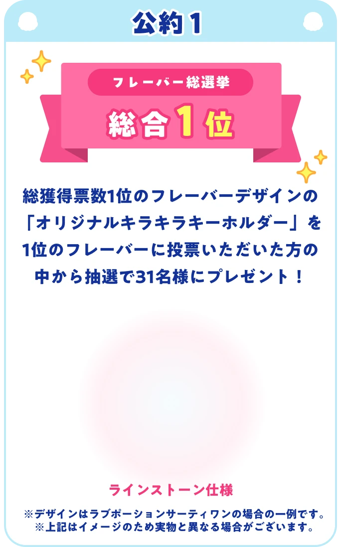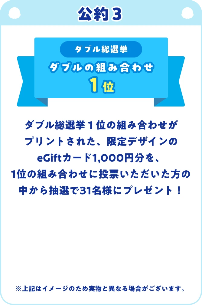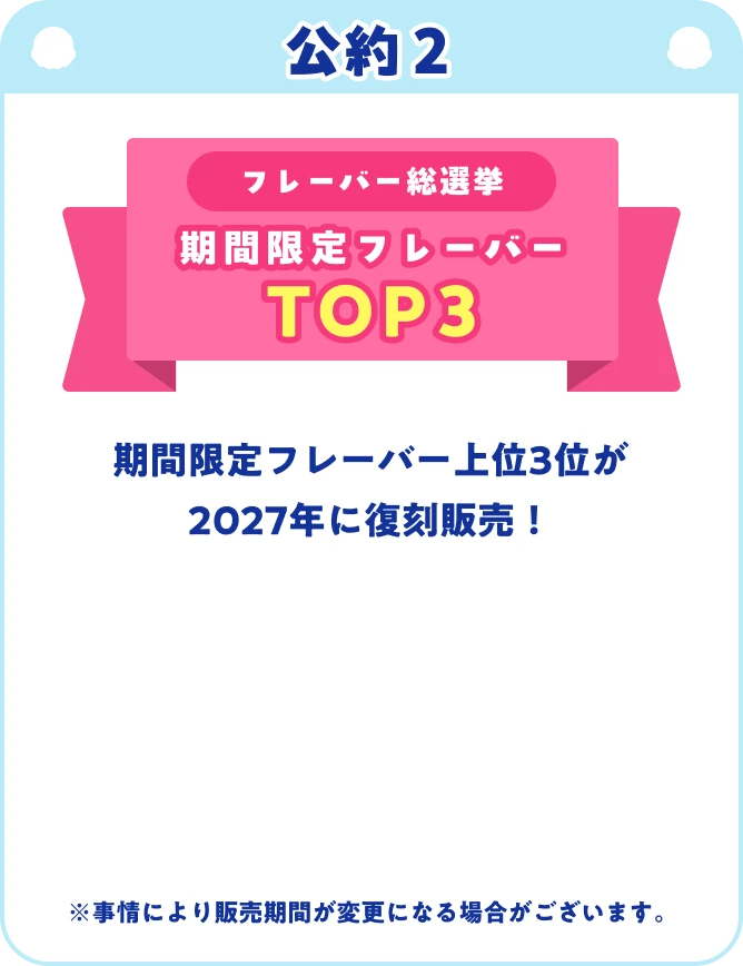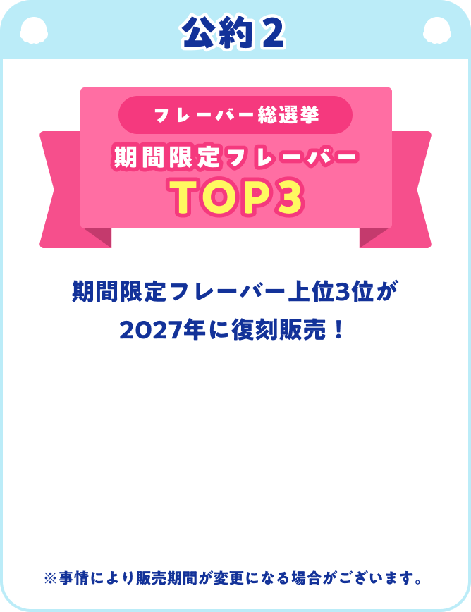 公約1: 総合1位のフレーバーがデザインされたオリジナルキーホルダーをプレゼントオリジナルキーホルダー公約2: 期間限定フレーバー上位3位が2027年に復刻販売1位2位3位公約3: ダブル総選挙1位の組み合わせがプリントされた限定eGiftカードをプレゼントeGiftカード 1,000円分 スペシャル版デザイン