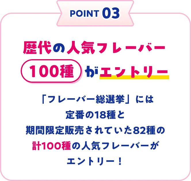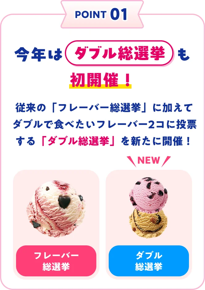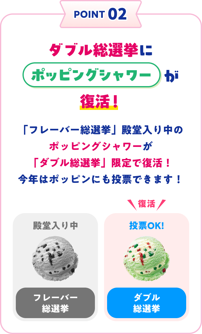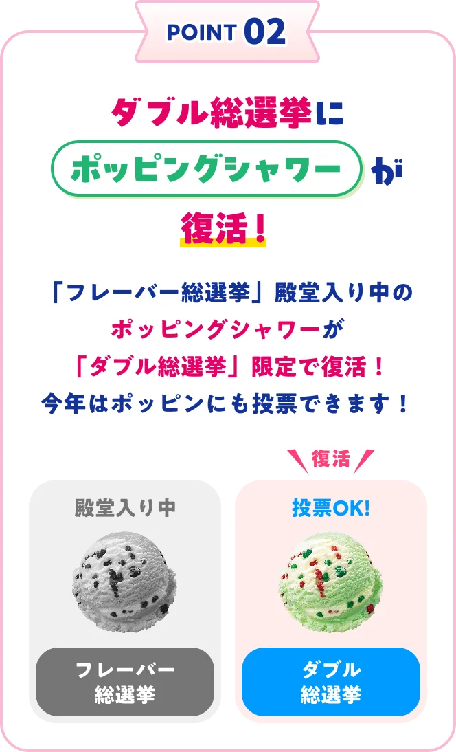 POINT 01: 今年はダブル総選挙も初開催!POINT 02: ダブル総選挙にポッピングシャワーが復活POINT 03: 歴代の人気フレーバー100種がエントリー投票期間 4/30 木まで結果発表 5/9 土 アイスクリームの日